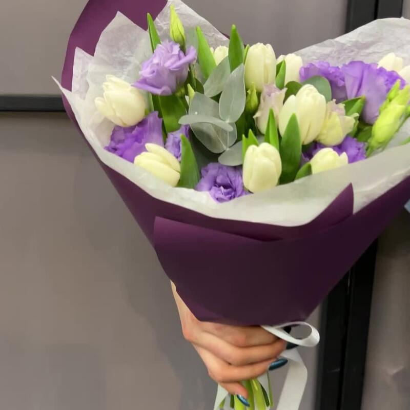 Тюльпан - 9 шт.эустома махровая - 2 шт.Эвкалипт - 1 шт.Тишью - 2 шт.Пленка матовая - 2 шт.Лента атласная - 2 шт.