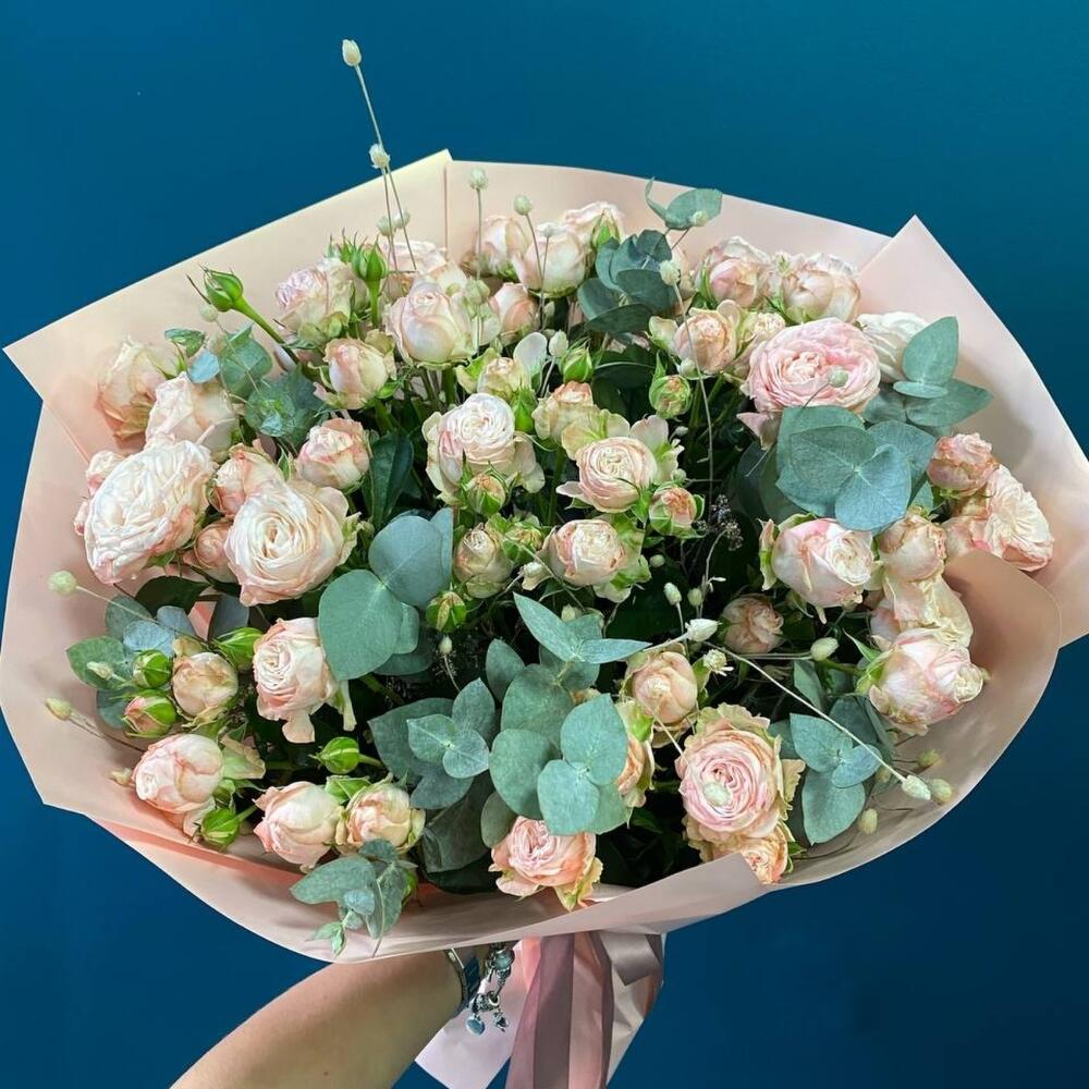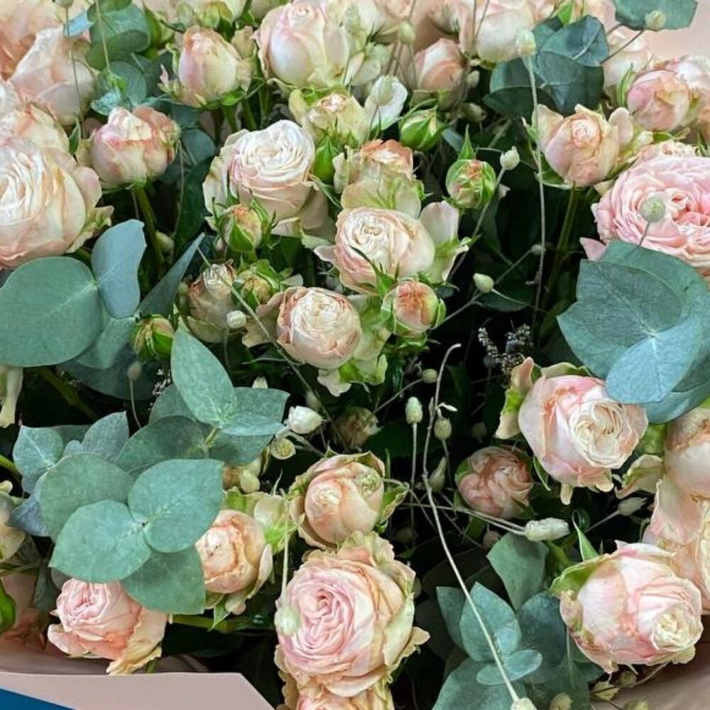 Упаковка дизайнерская - 2 шт. Эвкалипт Baby Blue - 1 шт. роза кустовая помбастик - 15 шт.