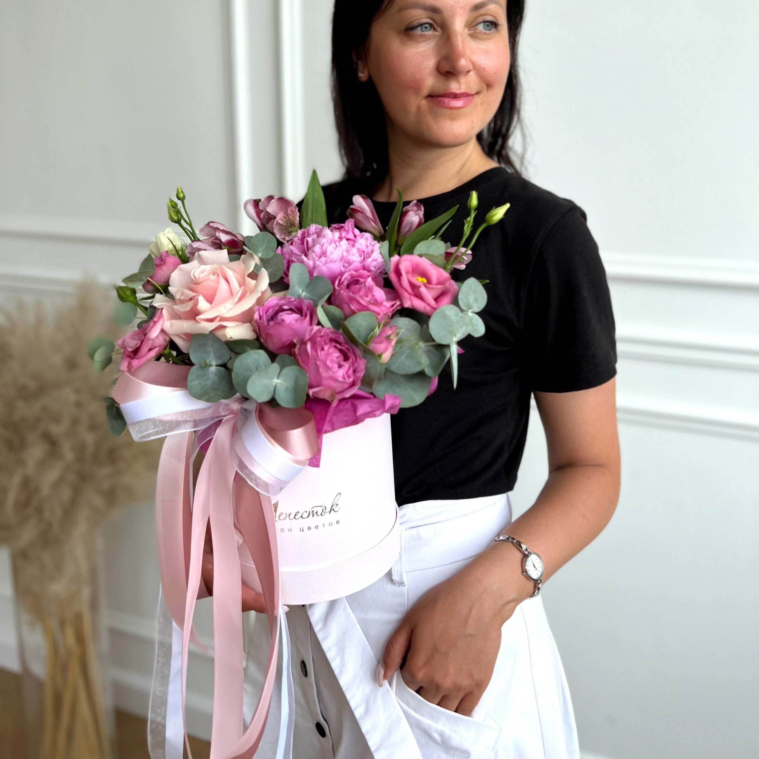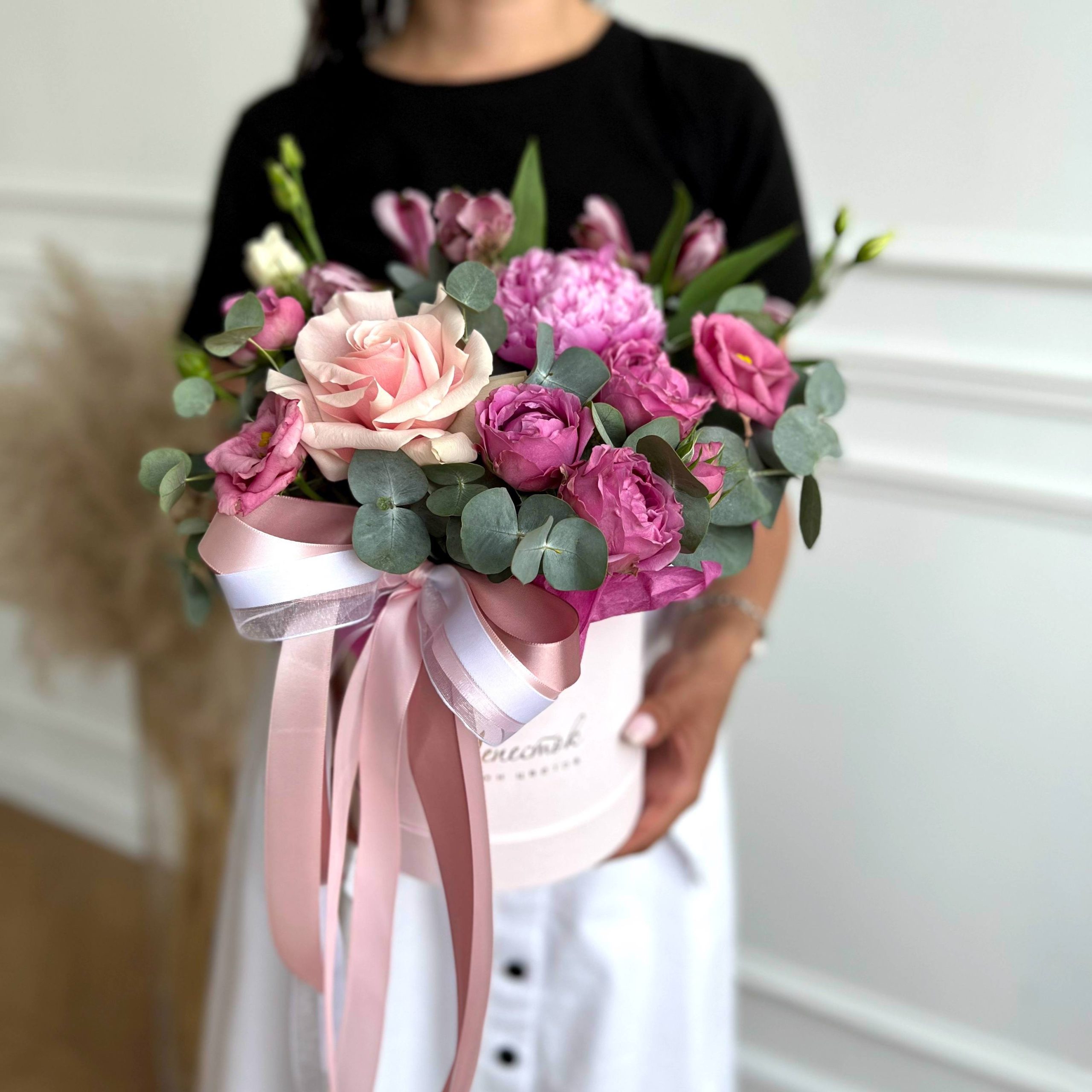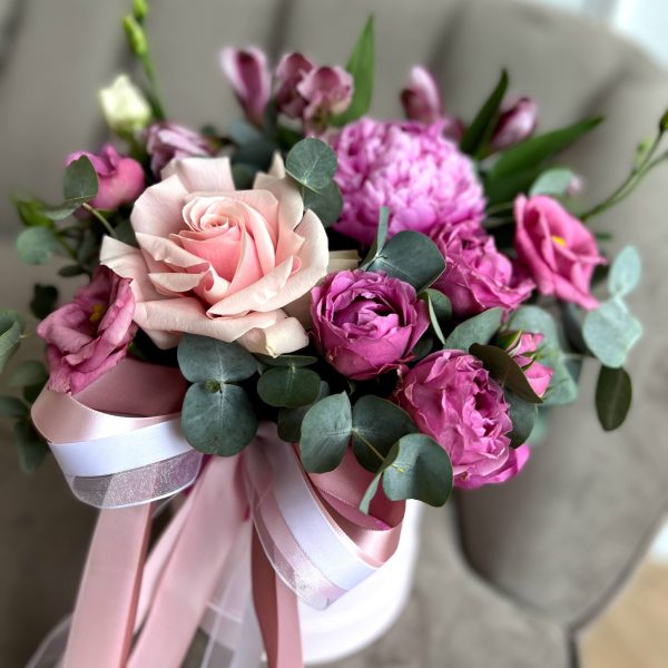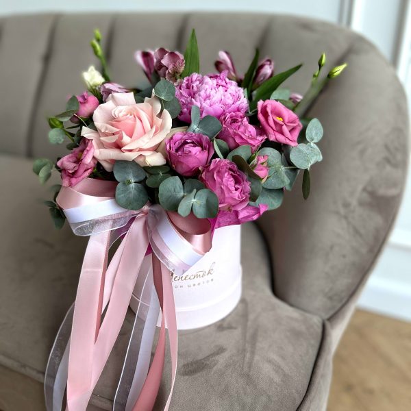 Цилиндр из пионов, пионовидной розы и альстромерии в Курчатове