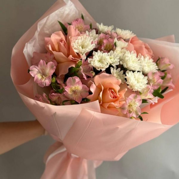 Розы, альстромерии и хризантемы – это утончённое сочетание текстур и цвета, которое создаёт яркий впечатляющий образ, наполненный нежностью и теплом. Букет отлично подойдёт к любому мероприятию.